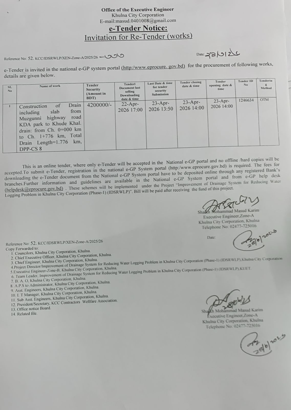 | ৪ | Construction of Drain including slab from Muzgunni highway road KDA park to Khude Khal. drain: from Ch. 0+000 km to Ch. 1+776 km, Total Drain Length=1.776 km, DPP-CS 8 | 2025/26-296 | ০৯-০৩-২০২৬ | দেখুন |